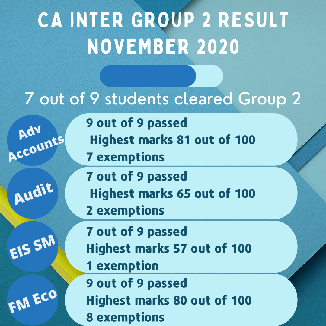 Our Inter/IPCC result has consistently been much higher than the national average, ranging between 60%-70% in different attempts. We teach all subjects so that we are able to promote a holistic approach to entire course preparation, rather than focusing on a single subject.Along with teaching, we guide, motivate and most importantly, make a sound strategy for each student individually for assured success.