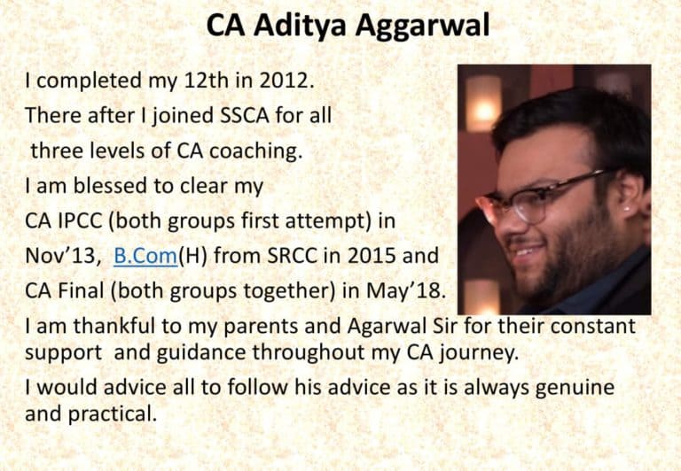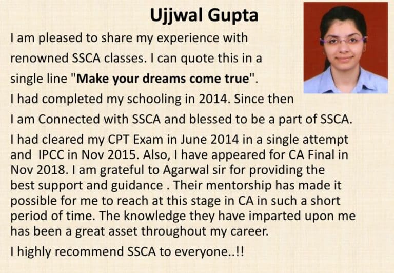 Since then I am Connected with SSCA and blessed to be a part of SSCA. I had cleared my CPT Exam in June 2014 in a single attempt and IPCC in Nov 2015. Also, I have appeared for CA Final in Nov 2018. I am grateful to Agarwal sir for providing the best support and guidance. Their mentorship has made it possible for me to reach at this stage in CA in such a short period of time. The knowledge they have imparted upon me has been a great asset throughout my career. I highly recommend SSCA to everyone..!!