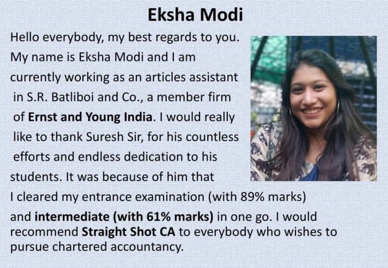 I would really like to thank Suresh Sir, for his countless efforts and endless dedication to his students. It was because of him that I cleared my entrance examination (with 89% marks) and intermediate (with 61% marks) in one go. I would recommend Straight Shot CA to everybody who wishes to pursue chartered accountancy.