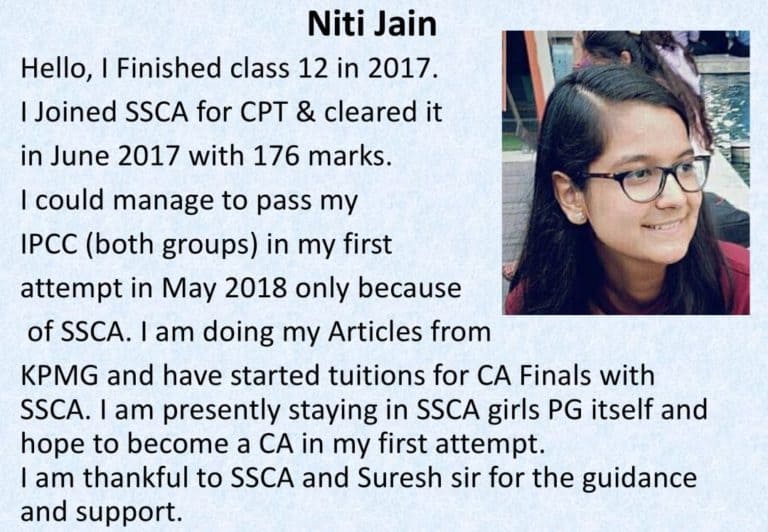 Hello, I Finished class 12 in 2017. I Joined SSCA for CPT & cleared it in June 2017 with 176 marks. I could manage to pass my IPCC (both groups) in my first attempt in May 2018 only because of SSCA.
