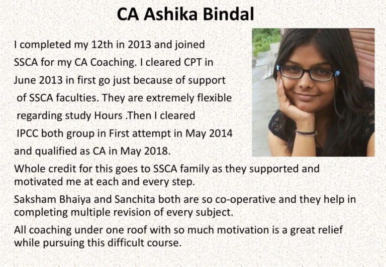 Then I cleared IPCC both group in First attempt in May 2014 and qualified as CA in May 2018. Whole credit for this goes to SSCA family as they supported and motivated me at each and every step. Saksham Bhaiya and Sanchita both are so co-operative and they help in completing multiple revision of every subject. All coaching under one roof with so much motivation is a great relief while pursuing this difficult course.