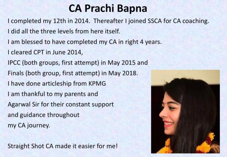 er(CPT) in her first attempt under the guidance of Mr. Suresh Agarwal of Straight shot CA institute, gurgaon. Subsequently, my ward has attempted the second gate (IPCC-Group-1) of this amazing professional degree in May’18 and she is dam sure to cross this one in her first attempt. The confidence, she attained, is the out come of untiring efforts of Straight shot faculty under the effective supervision of Mr. Agarwal. His way of teaching with in-depth detailing of subjects enriches the student to face every challange in the examination.
